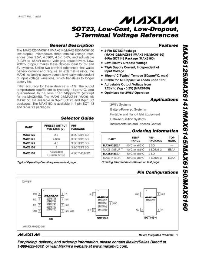 MAX6125, MAX6141, MAX6145, MAX6150, MAX6160 SOT23, Low-Cost, Low-Dropout, 3-Terminal Voltage References