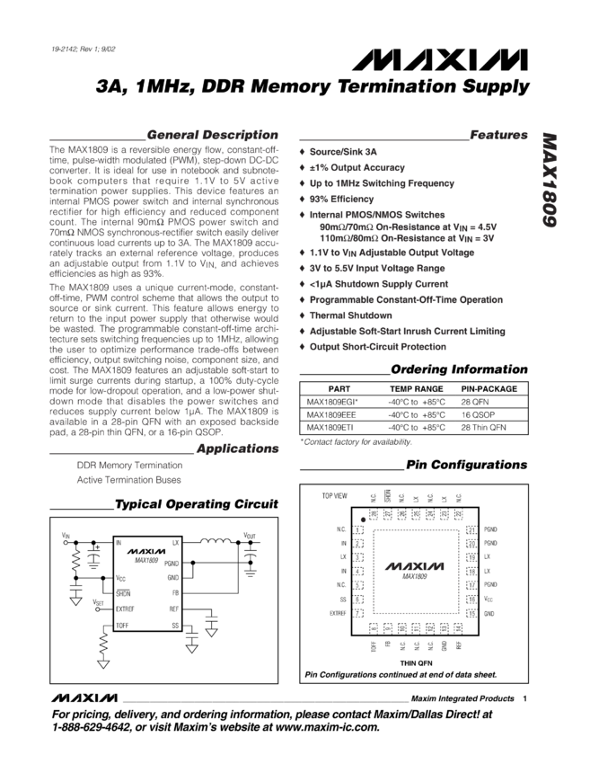 MAX1809 3A, 1MHz, DDR Memory Termination Supply