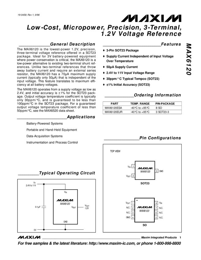 MAX6120 Low-Cost, Micropower, Precision 3-Terminal, 1.2V Voltage Reference