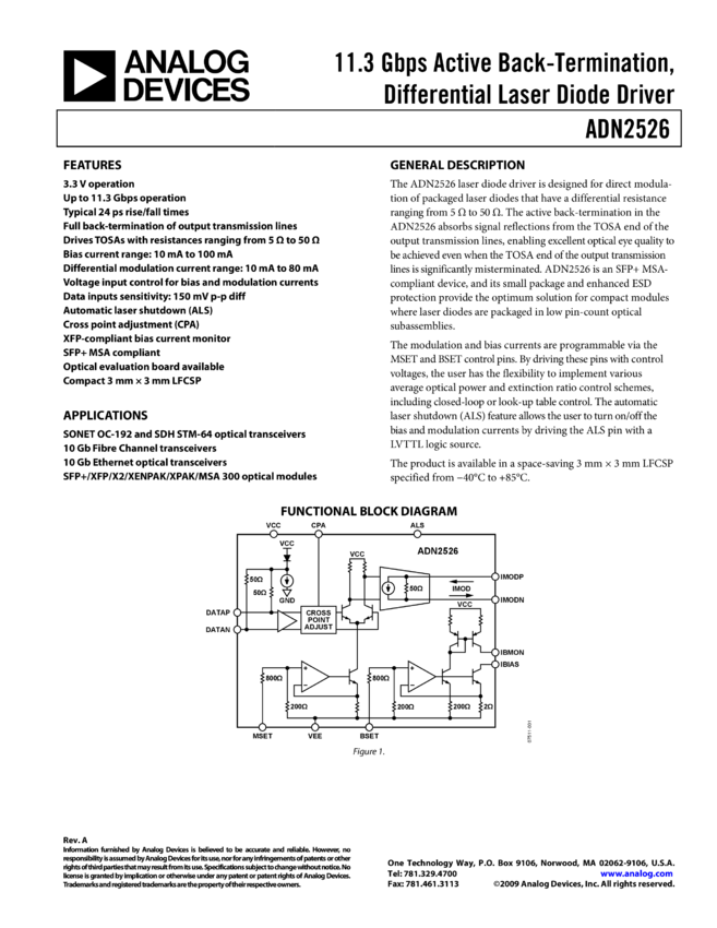 ADN2526: 11.3 Gbps Active Back-Termination Differential Laser Diode Driver