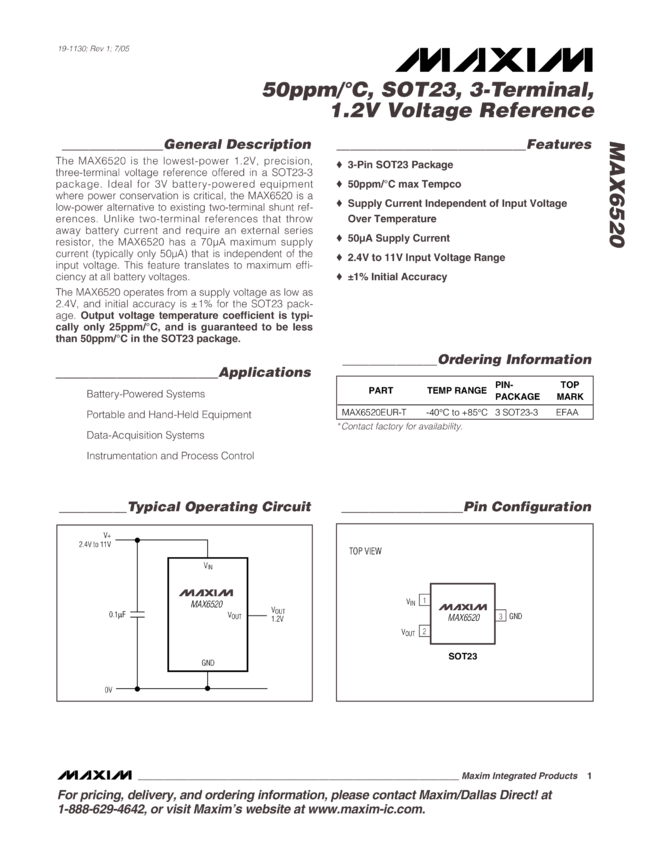 MAX6520 50ppm/°C, SOT23, 3-Terminal, 1.2V Voltage Reference