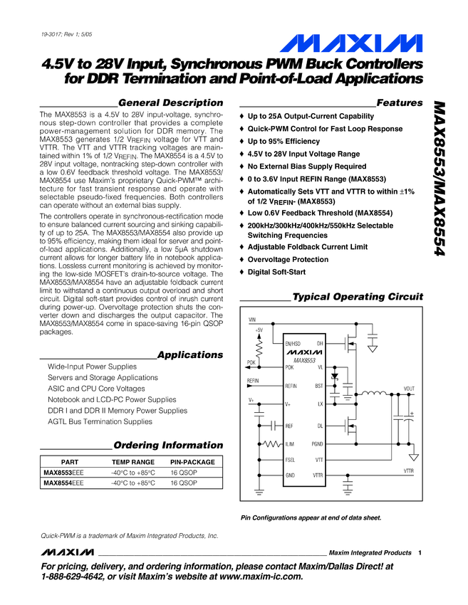 MAX8553, MAX8554 4.5V to 28V Input, Synchronous PWM Buck Controllers for DDR Termination and Point-of-Load Applications