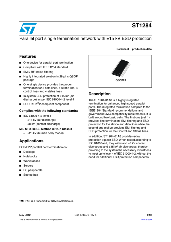 17-line EMI filter and ESD protection with Termination and R pull-up for ST1284 interfaces