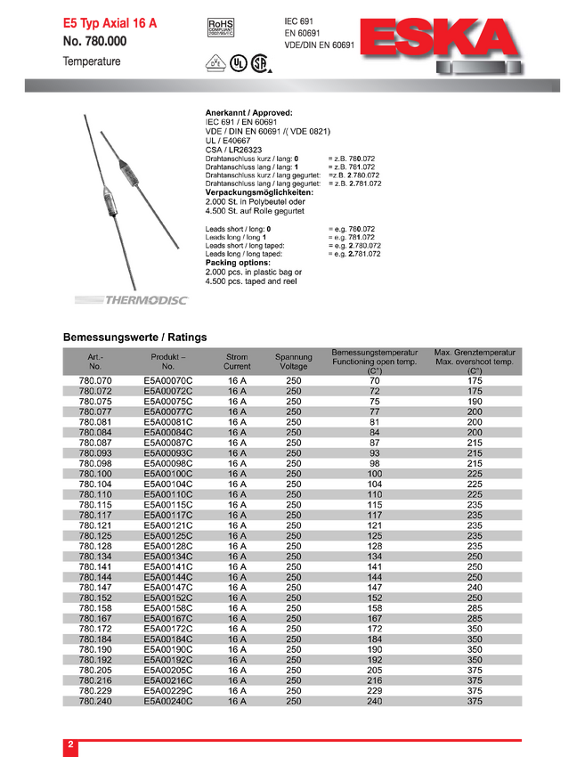 Bezpiecznik termiczny 121 °C 16 A 250 V/AC ESKA E5A00121C 1 szt.