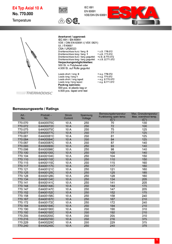 Bezpiecznik termiczny 144 °C 10 A 230 V/AC (Ø) 4 mm ESKA 771.144 1 szt.