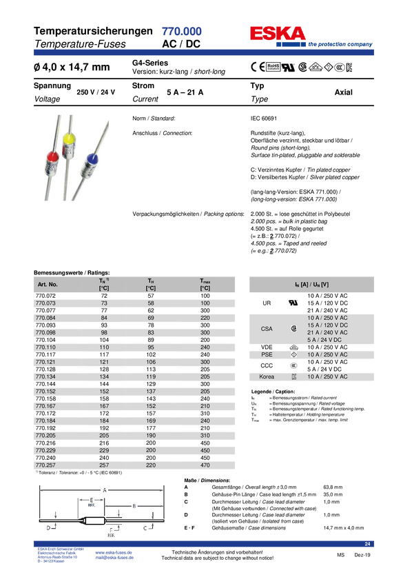 Bezpiecznik termiczny 240 °C 10 A 250 V/AC (Ø x D) 4 mm x 64.5 mm ESKA 770.240 1 szt.