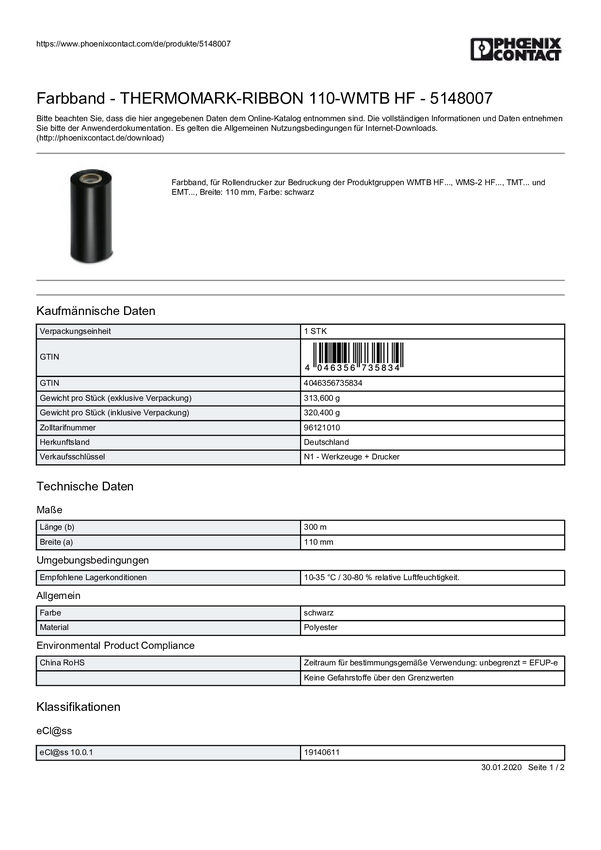 Taśma kolorowa do drukarki termotransferowej Phoenix Contact THERMOMARK-RIBBON 110-WMTB HF 5148007, 1 szt.