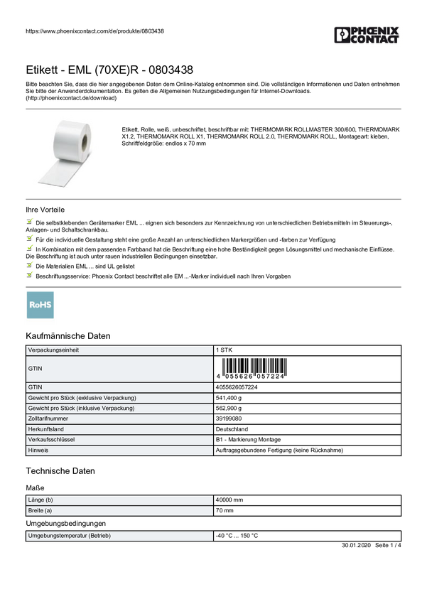 Etykiety do drukarki termotransferowej Phoenix Contact EML (70XE)R 0803438, montaż: przyklejanie, 1 szt.