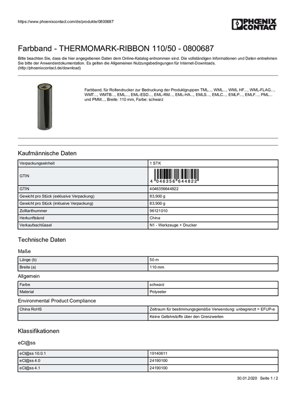 Taśma kolorowa do drukarki termotransferowej Phoenix Contact THERMOMARK-RIBBON 110/50 0800687, 1 szt.