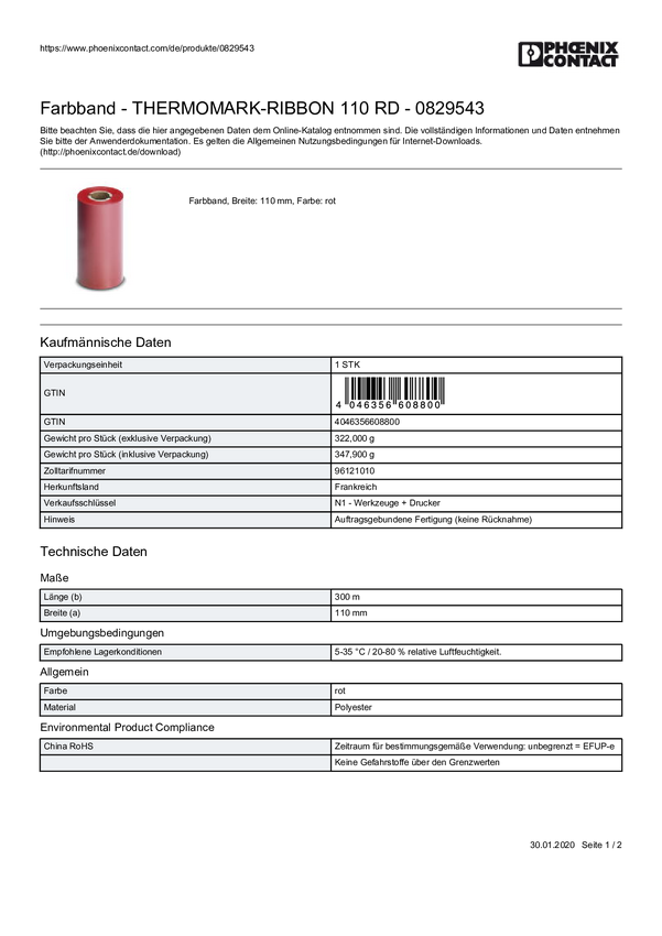 Taśma kolorowa do drukarki termotransferowej Phoenix Contact THERMOMARK-RIBBON 110 RD 0829543, 1 szt.