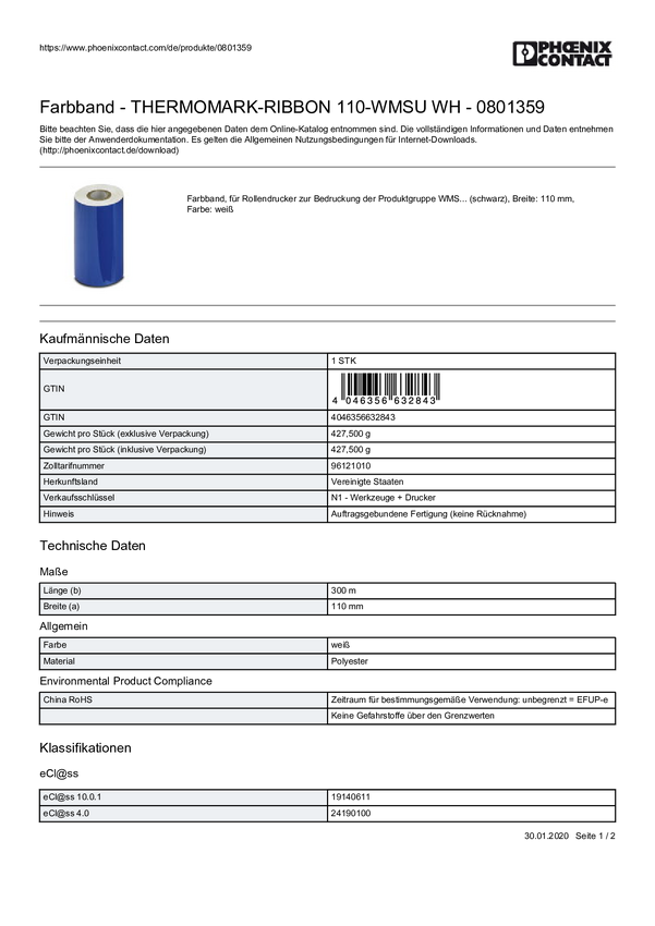 Taśma kolorowa do drukarki termotransferowej Phoenix Contact THERMOMARK-RIBBON 110-WMSU WH 0801359, 1 szt.