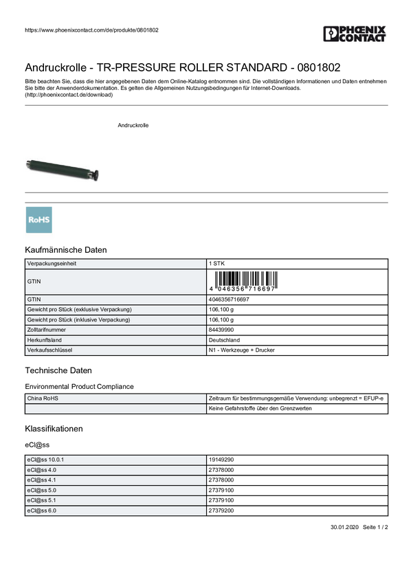 Phoenix Contact 0801800 TR-PRESSURE ROLLER DR4-50 Akcesorium do drukarek termotransferowych czarny, srebrny 1 szt.