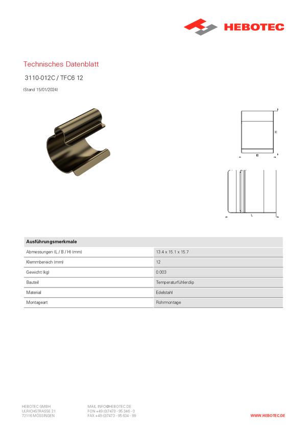 Hebotec TFC6 12 Zacisk czujnika temperatury
