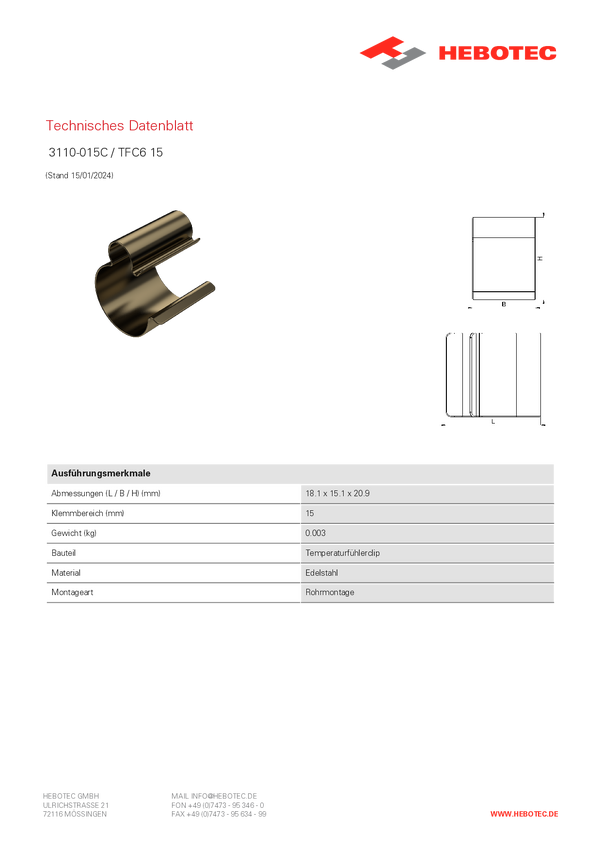 Hebotec TFC6 15 Zacisk czujnika temperatury