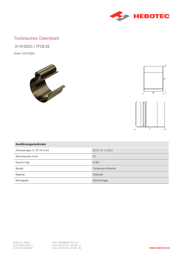 Hebotec TFC6 22 Zacisk czujnika temperatury