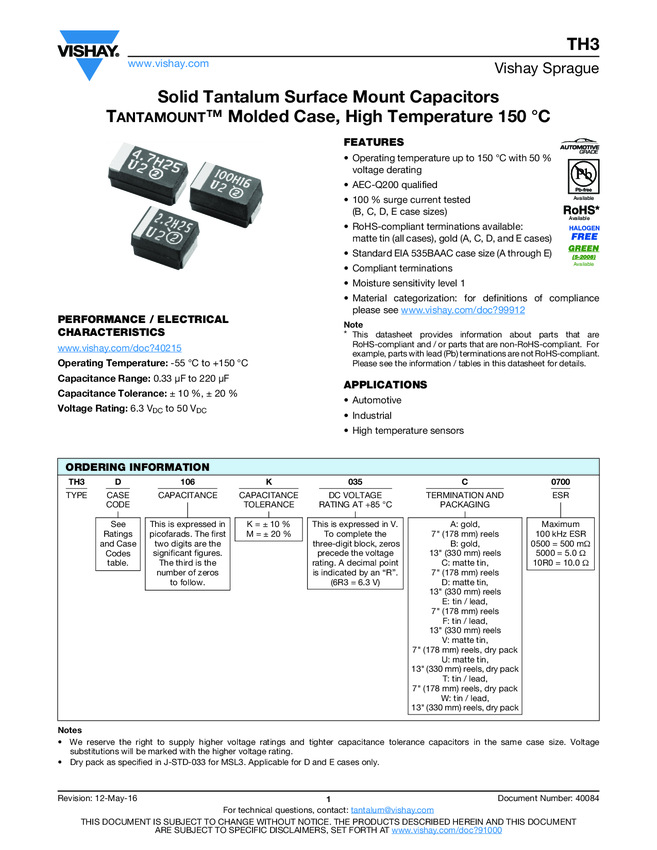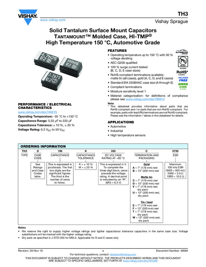 Solid Tantalum Surface Mount Capacitors TANTAMOUNT™ Molded Case, HI-TMP® High Temperature 150 °C, Automotive Grade