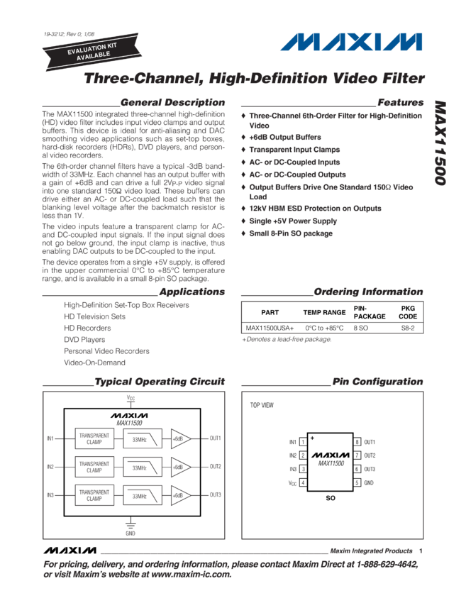 MAX11501, MAX11502 Three-Channel, Standard-Definition Video Filters