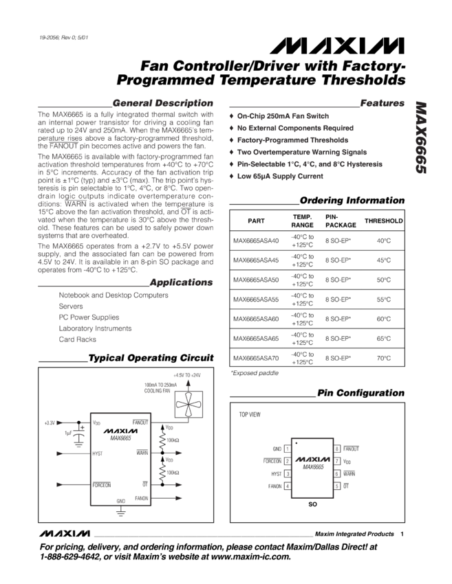 MAX6665 Fan Controller/Driver with Factory-Programmed Temperature Thresholds
