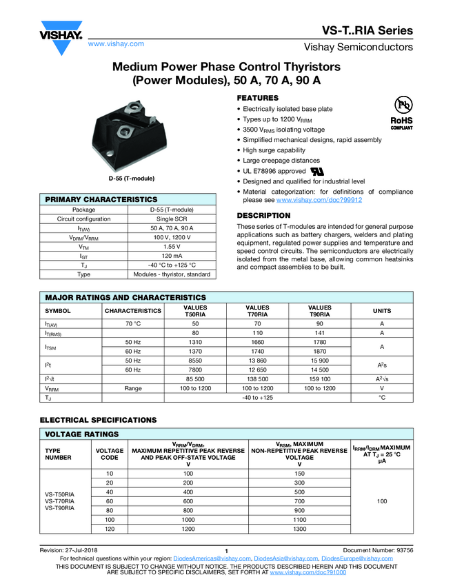 Medium Power Phase Control Thyristors (Power Modules), 50 A, 70 A, 90 A