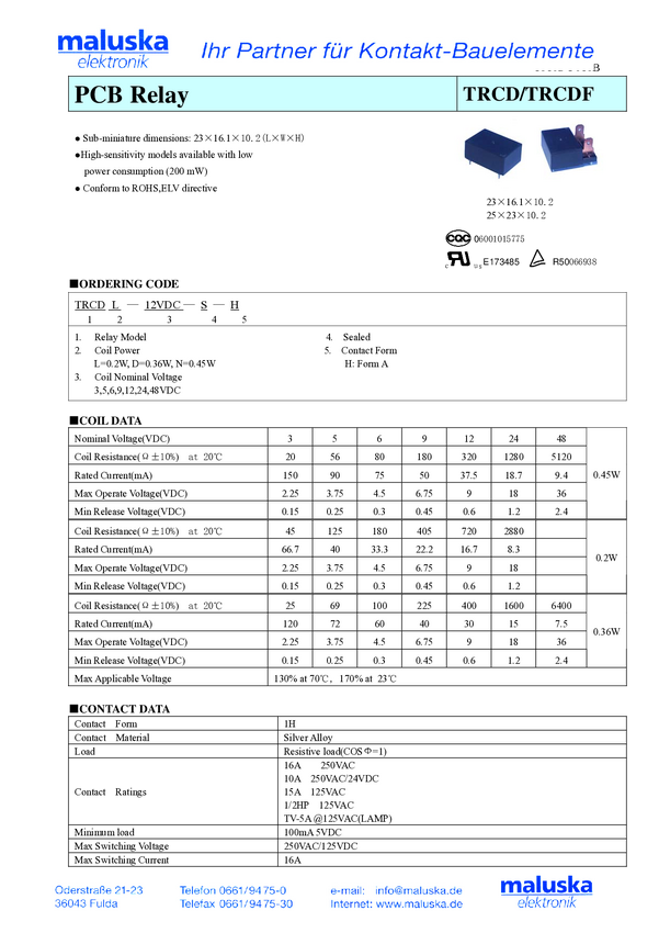 Przekaźnik PCB TRCD Tianbo Electronics TRCD-L-12VDC-S-H 12 V/DC 1 zestyk zwierny