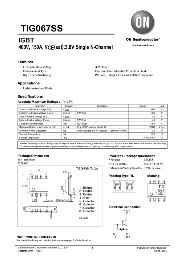 IGBT 400V 150A VCE(sat);5.0V max. Nch Single SOIC8