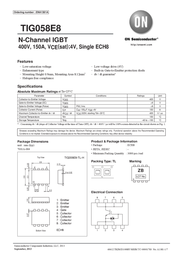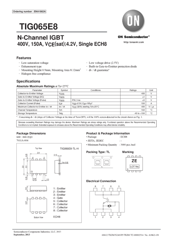 N-Channel IGBT, 400V, 150A, VCE(sat);4.2V, Single ECH8