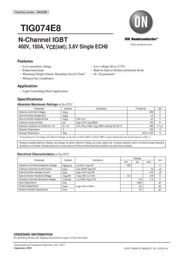 IGBT 400V 150A VCE(sat);5.6V max. N-Channel Single ECH8