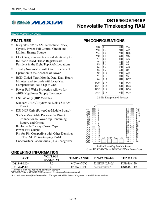 DS1556, DS1556P 1M, Nonvolatile, Y2K-Compliant Timekeeping RAM
