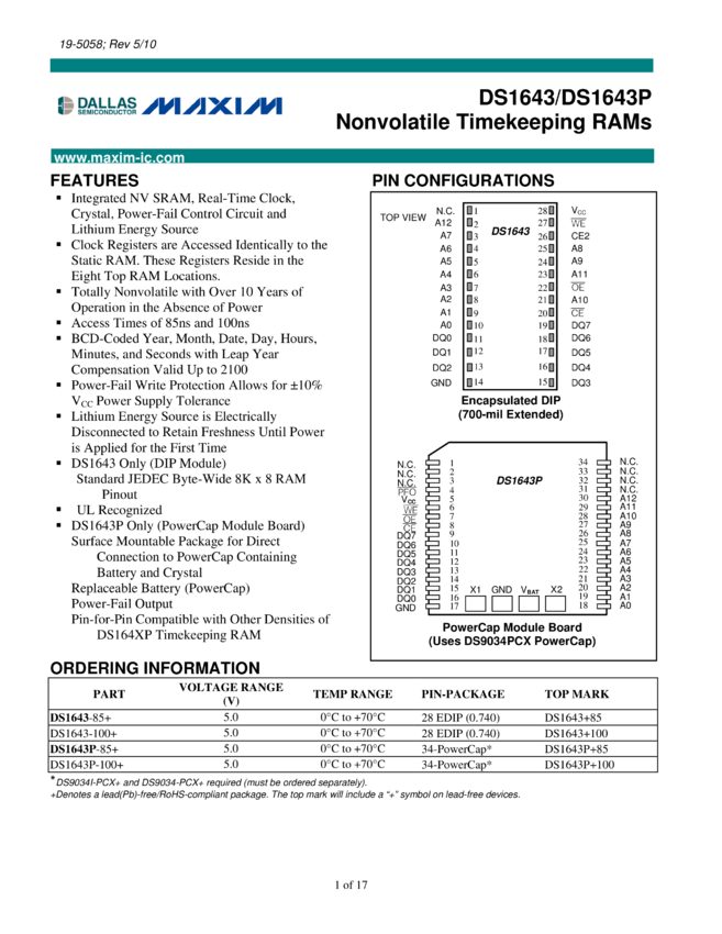 DS1643, DS1643P Nonvolatile Timekeeping RAM