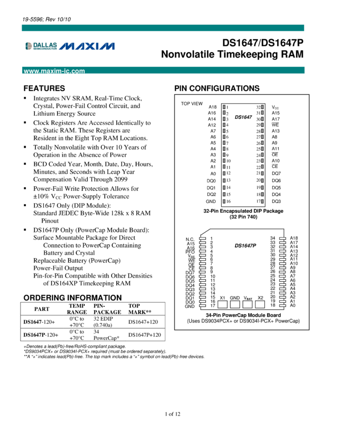 DS1647, DS1647P Nonvolatile Timekeeping RAM