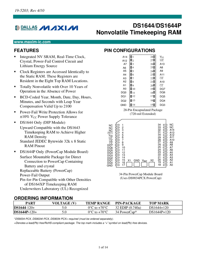 DS1644, DS1644P Nonvolatile Timekeeping RAM