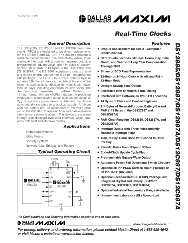 DS12885, DS12887, DS12887A, DS12C887, DS12C887A Real-Time Clocks