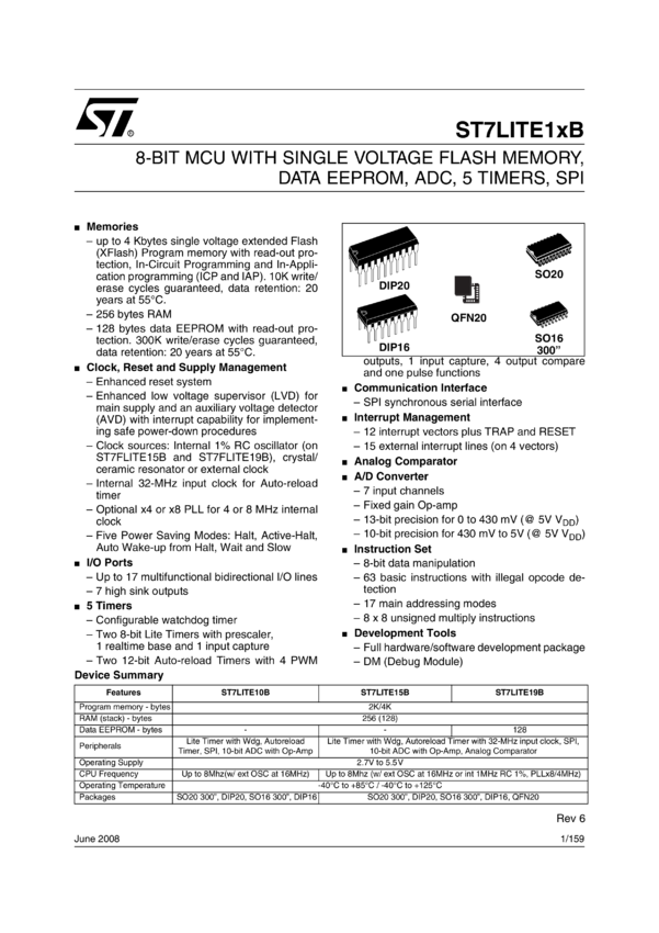 8-BIT MCU WITH SINGLE VOLTAGE FLASH MEMORY, DATA EEPROM, ADC, 5 TIMERS, SPI