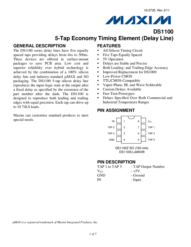 DS1100 5-Tap Economy Timing Element (Delay Line)