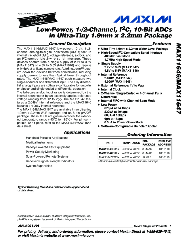 MAX11646, MAX11647 Low-Power, 1-/2-Channel, I²C, 10-Bit ADCs in Ultra-Tiny 1.9mm x 2.2mm Package