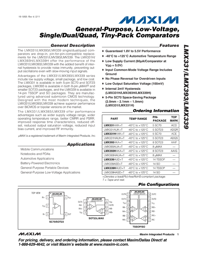 LMX331, LMX331H, LMX339, LMX339H, LMX393, LMX393H General-Purpose, Low-Voltage, Single/Dual/Quad, TinyPack™ Comparators