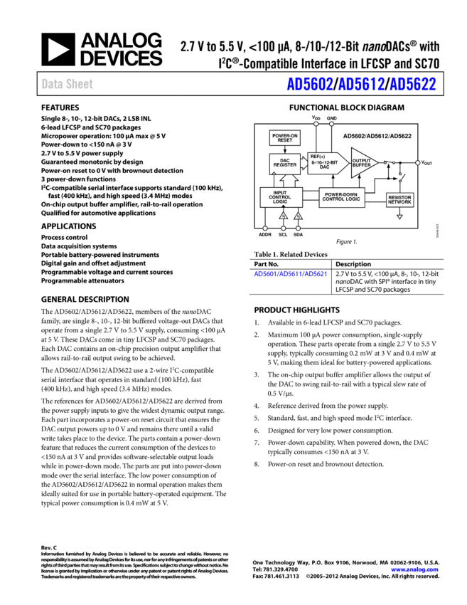 AD5622: 2.7 V to 5.5 V, DAC® with IC Compatible Interface, Tiny SC70 Package