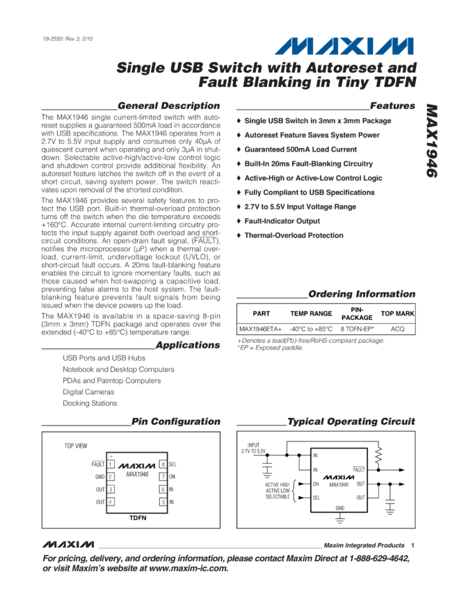 MAX1946 Single USB Switch with Autoreset and Fault Blanking in Tiny TDFN