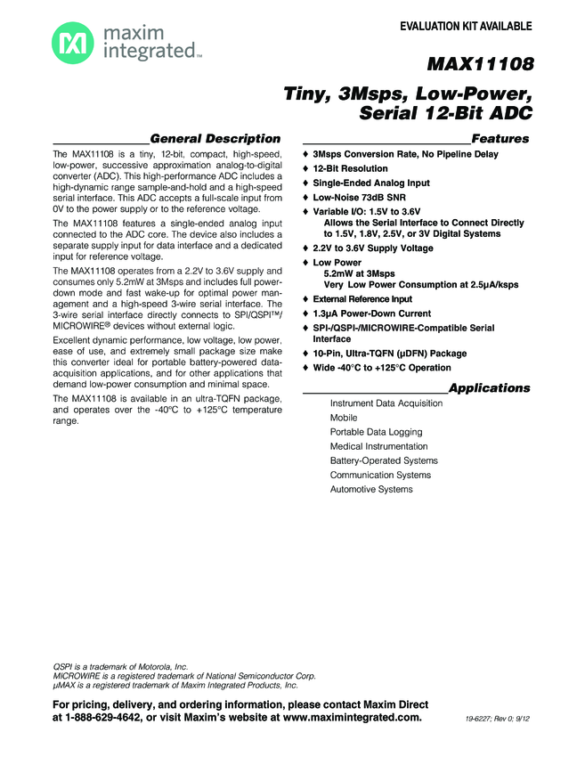 MAX11108 Tiny 12-Bit, Low-Power, 3Msps, Serial ADC