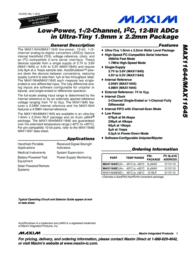 MAX11644, MAX11645 Low-Power, 1-/2-Channel, I²C, 12-Bit ADCs in Ultra-Tiny 1.9mm x 2.2mm Package