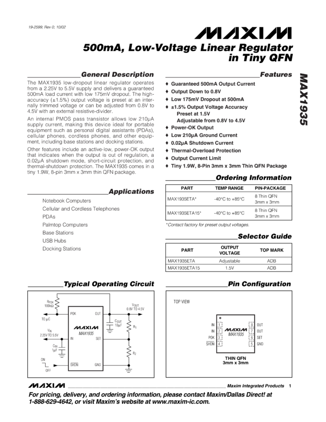 MAX1935 500mA, Low-Voltage Linear Regulator in Tiny QFN
