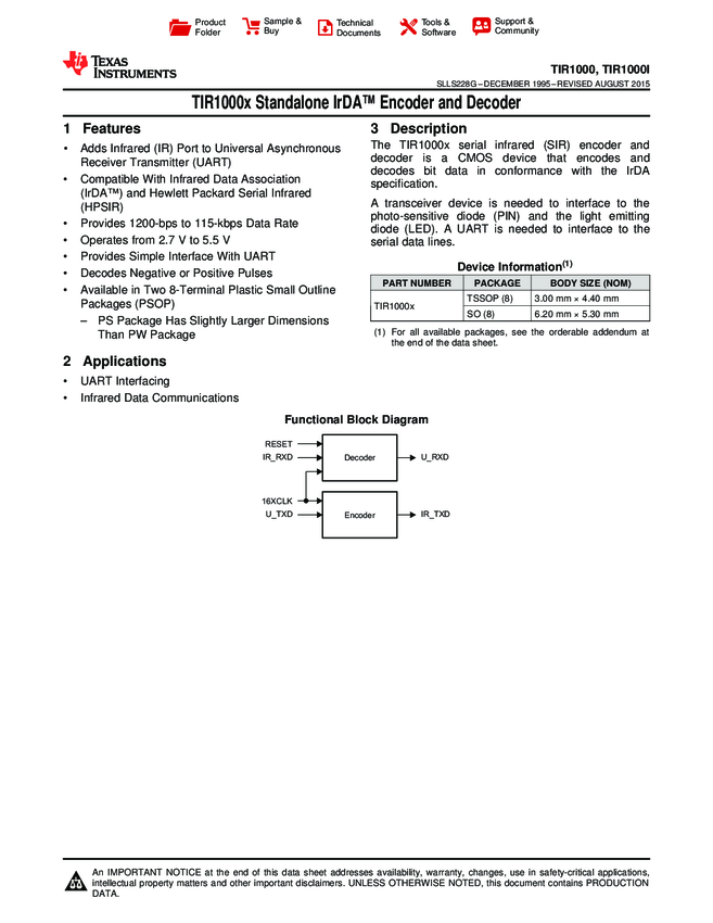 IrDA Encoder and Decoder 8-Pin TSSOP T/R