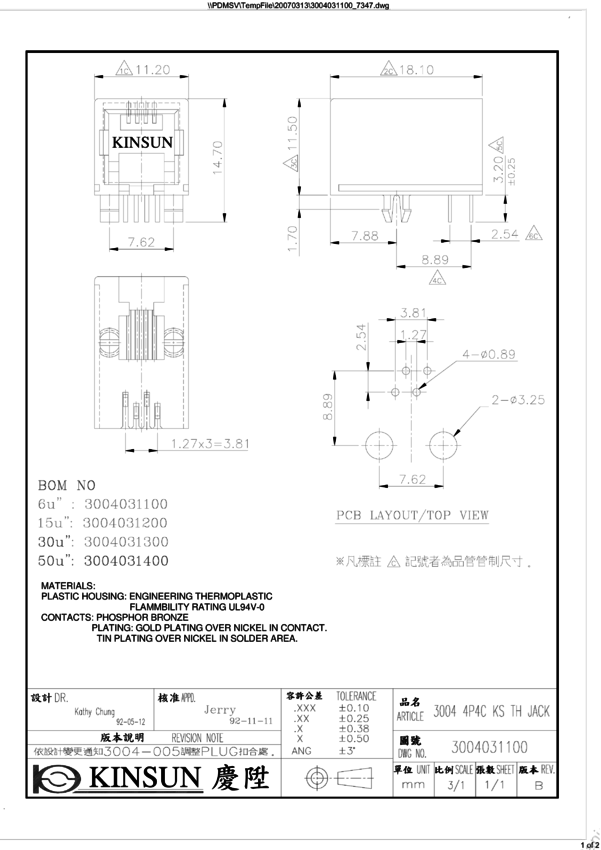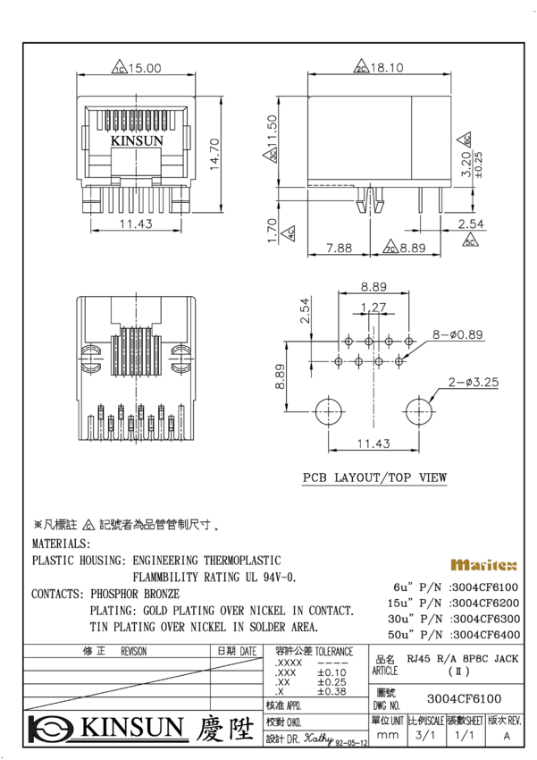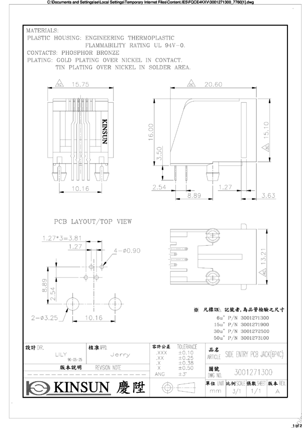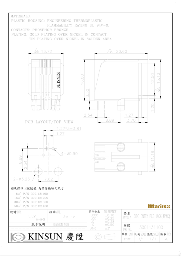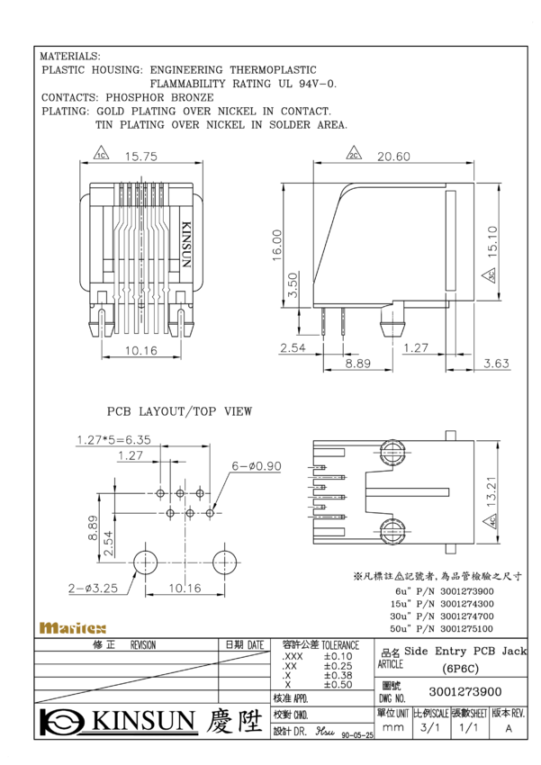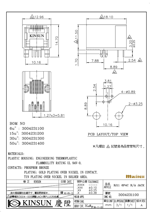 Gniazdo , 4-stykowe, gabaryt 6, styki 6μ" Au, KINSUN