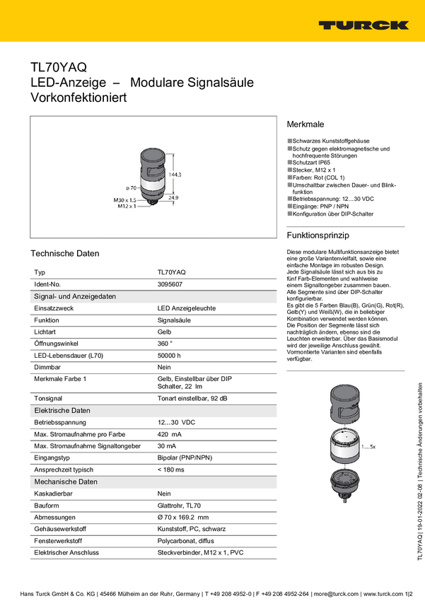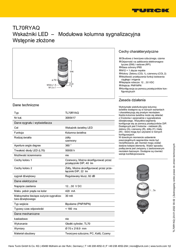 Kolumna sygnalizacyjna Turck TL70YAQ 3095607 1 szt.