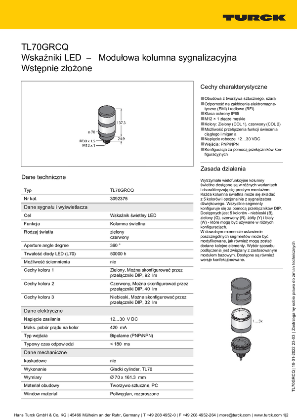Kolumna sygnalizacyjna Turck TL70GRCQ 3092375 1 szt.