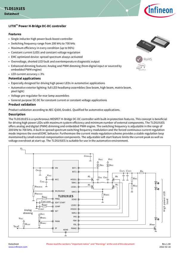 TLD5191ES - a synchronous MOSFET H-Bridge DC-DC controller with built-in protection features The TLD5191ES is a synchronous MOSFET H-Bridge DC-DC controller for high power LED driving. It offers analog/digital dimming, adjustable switching frequency (200 kHz to 700 kHz), and spread spectrum modulation for improved EMC behavior. The current mode regulation ensures stability with small external components. The controller has built-in protection features, adjustable soft start, and is suitable for automotive