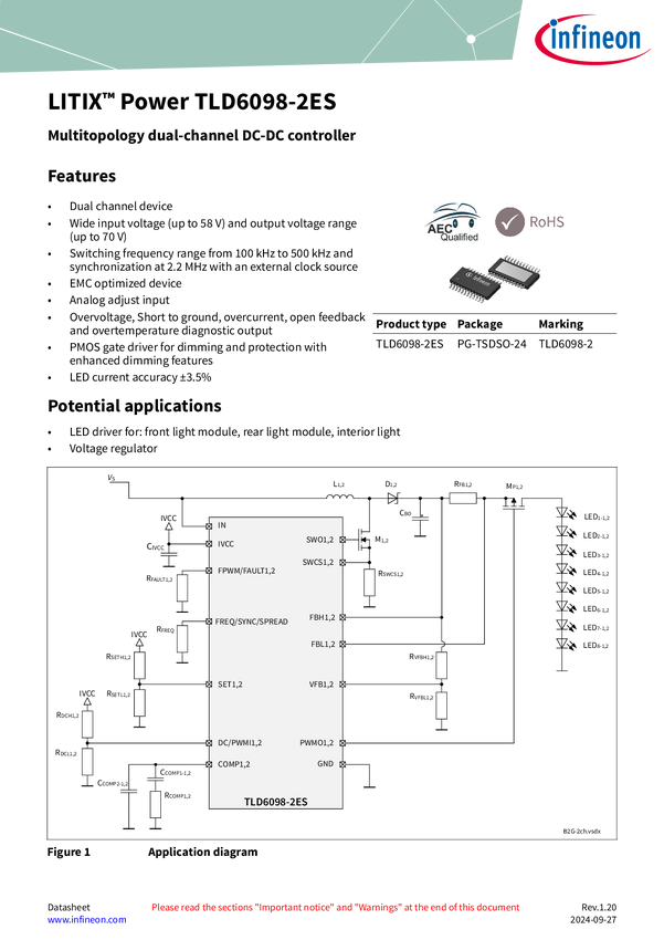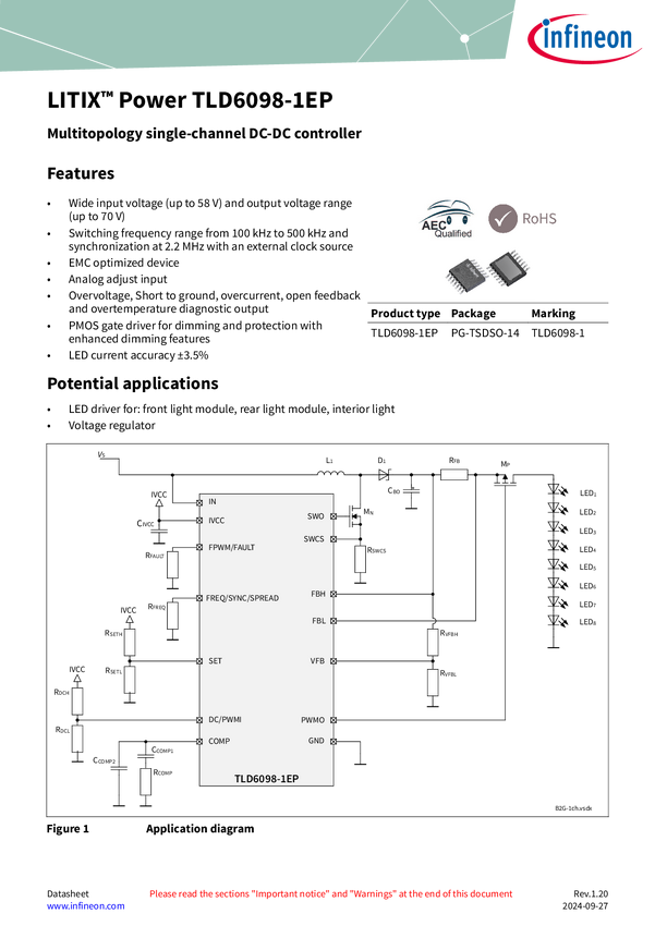 DC-DC boost controller with spread spectrum frequency modulation and with built-in diagnosis and protection features designed for LED drivers. LITIX™ Power TLD6098-1EP: DC-DC boost controller for LED drivers. Supports Boost, Buck, Buck-Boost, SEPIC, and Flyback topologies. Features built-in diagnosis, protection, and spread spectrum modulation for improved EMI performance. Integrated pulse width modulator adjusts LED brightness without color shift. It continuously monitors the load status: LED overcurrent,