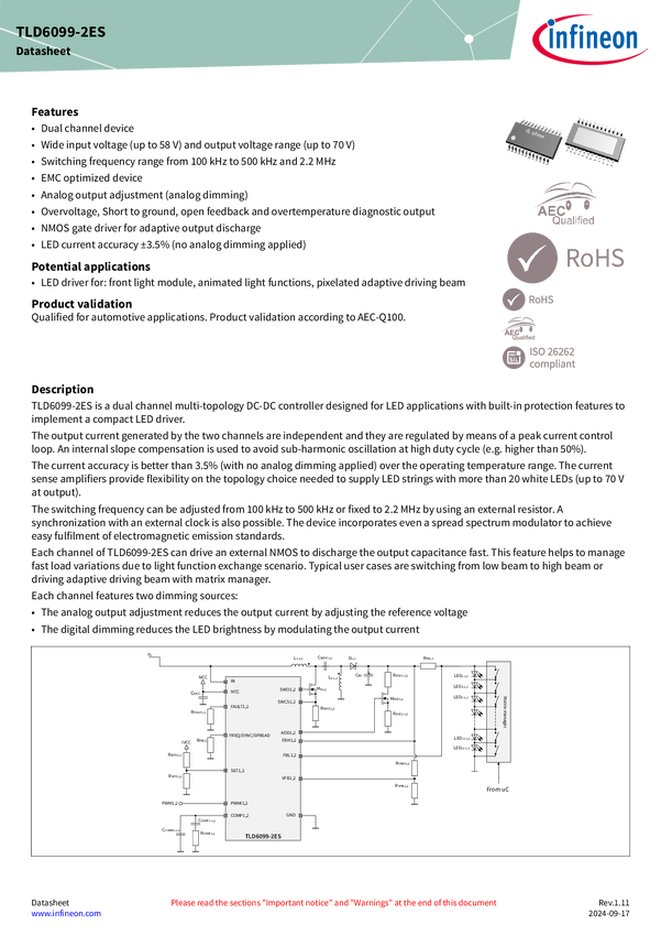 Multitopology DC-DC controller | 4.5 to 58 V | 5000 µA | 100 to 2200 kHz | 3,5% The TLD6099-2ES is a dual channel multi-topology DC-DC controller for LED applications with built-in protection features for a compact LED driver. Each channel drives an external NMOS to discharge the output capacitance fast, managing load variations. Typical user cases are switching from low beam to high beam or driving adaptive driving beam with matrix manager.
