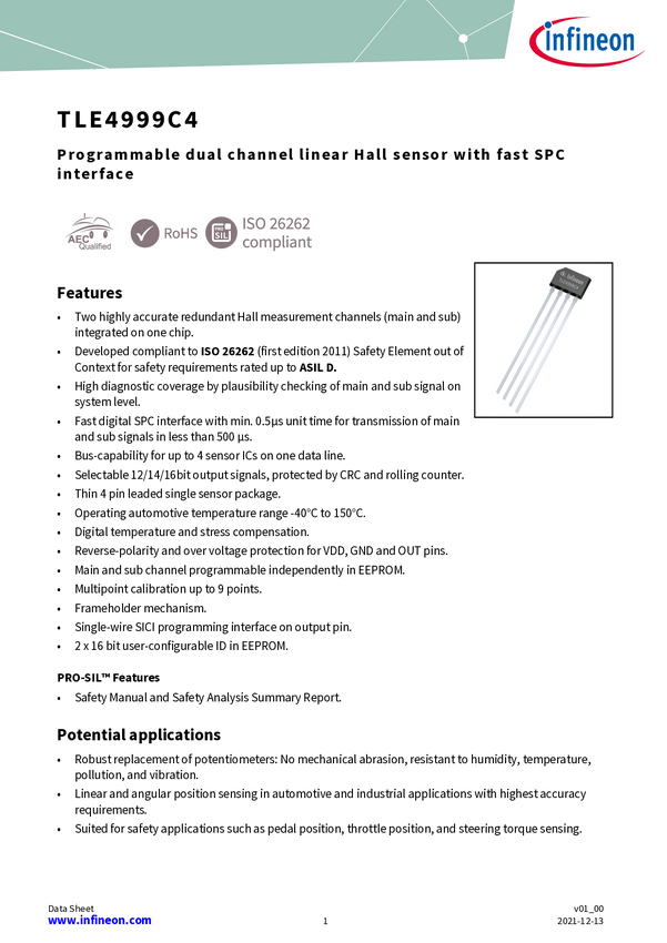 XENSIV™ - TLE4999C4 programmable dual channel linear Hall sensor for safety critical automotive applications TLE4999C4 is ISO 26262-compliant, offering high redundancy with two sensor elements on one chip. It ensures premium functional safety (up to ASIL D) with separate signal paths, plausibility checks, and diagnostic coverage. The digital SPC protocol based on SENT standard is provided on the OUT pin. Calibration via SICI after assembly, separate analog supply domains, and 4 output signal modes with CRC