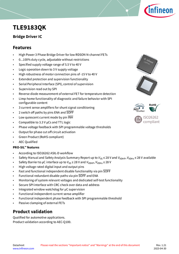 MOTIX™ TLE9183QK motor gate driver IC for 12 V brushless DC motor control and safety-relevant applications The MOTIX™ TLE9183QK is a gate driver IC dedicated to control 6 external N-channel MOSFETs for BLDC motor drive automotive applications.Three integrated current sense amplifiers for shunt signal conditioning are integrated. Thanks to the powerful driver stage with typ. 2 A output current per channel, the 3-phase gate driver is ideally suited for 12V safety related applications. This device is develope